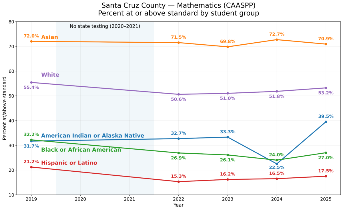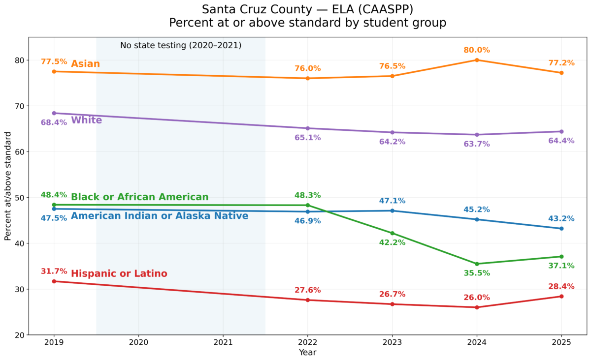 On the English Language Arts test of the State Assessment (CAASPP), Santa Cruz County’s results show a clear and persistent achievement gap by student group. Asian and White students consistently have the highest percentages meeting or exceeding standards, while Hispanic/Latino students are consistently the lowest, and Black/African American and American Indian/Alaska Native students remain well below the county’s highest-performing groups. Across the full trendline, the gap remains substantial: higher-performing groups stay relatively stable in the mid-60s to around 80%, while other groups remain clustered far lower—often in the 20s to 40s—demonstrating that overall performance is not improving evenly and outcomes continue to vary sharply by student demographics.