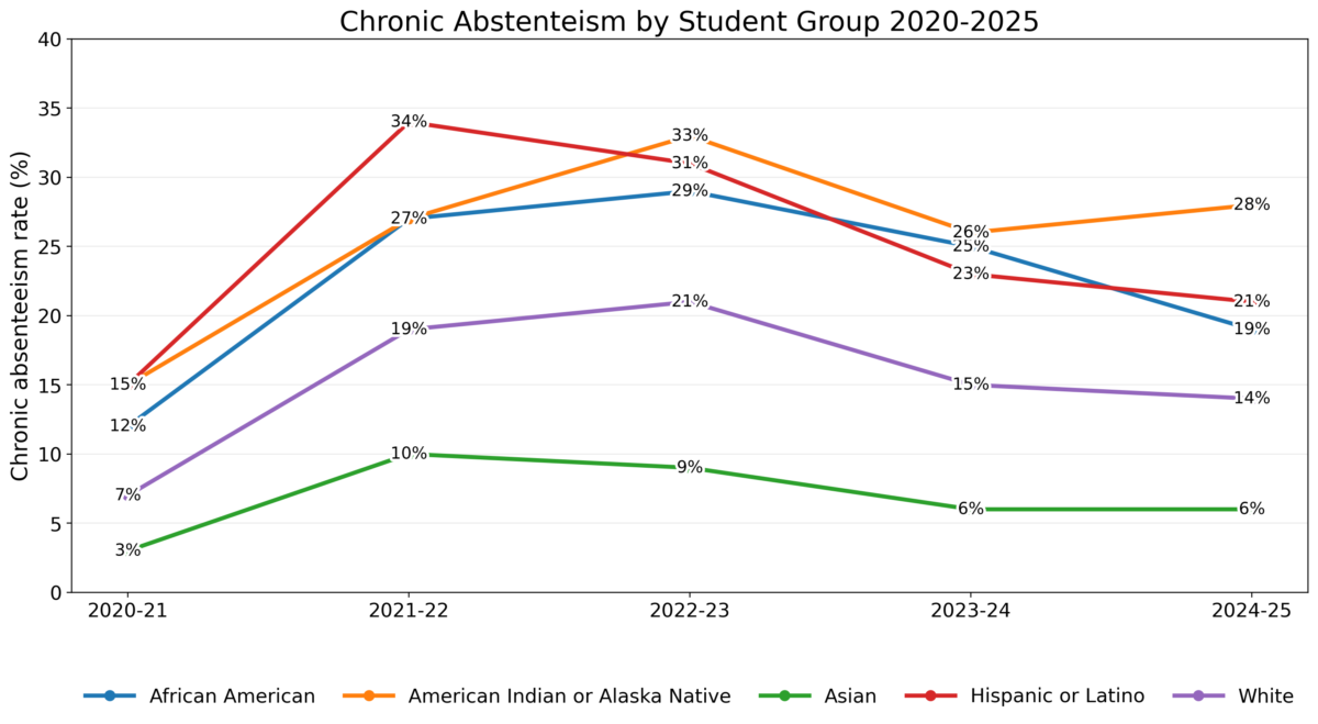 Chronic absenteeism rose dramatically during and immediately after the pandemic, with every student group jumping sharply from 2020–21 to 2021–22 and remaining elevated into 2022–23. The highest rates were consistently among Hispanic/Latino students (peaking at 34% in 2021–22) and American Indian/Alaska Native students (peaking at 33% in 2022–23), followed by African American students (peaking at 29% in 2022–23). Encouragingly, rates declined for all groups in 2023–24 and continued to improve in 2024–25, but they have not returned to pre-surge levels for most groups—especially for American Indian/Alaska Native (28%) and Hispanic/Latino (21%) students—while White students declined to 14% and Asian students remained lowest at 6%.