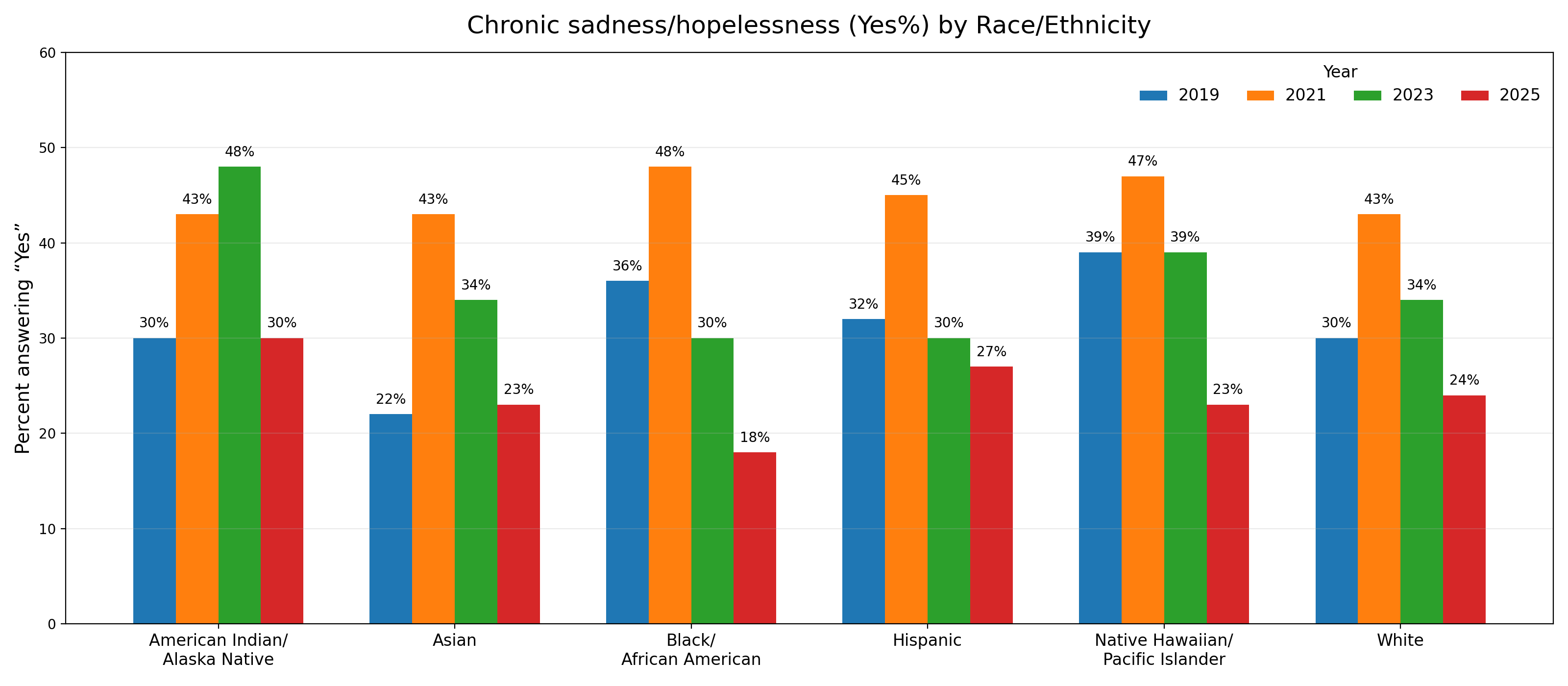 This chart provides a visual breakdown of the responses to a key mental health indicator from the California Healthy Kids Survey, focusing on the frequency of feelings of sadness or hopelessness among students from various ethnic backgrounds over several years.Across all racial/ethnic groups, reports of chronic sadness/hopelessness generally peaked in 2021 and then declined by 2025. In 2021, “Yes” rates were highest across the board—about 43% for American Indian/Alaska Native, Asian, and White, 45% for Hispanic, 47% for Native Hawaiian/Pacific Islander, and 48% for Black/African American. By 2025, rates dropped substantially for most groups: Black/African American (18%) was lowest, Asian (23%) and NH/PI (23%) were similar, White (24%) and Hispanic (27%) remained somewhat higher, and American Indian/Alaska Native (30%) was highest. Overall, the data show broad improvement after 2021, though differences between groups persist in 2025.