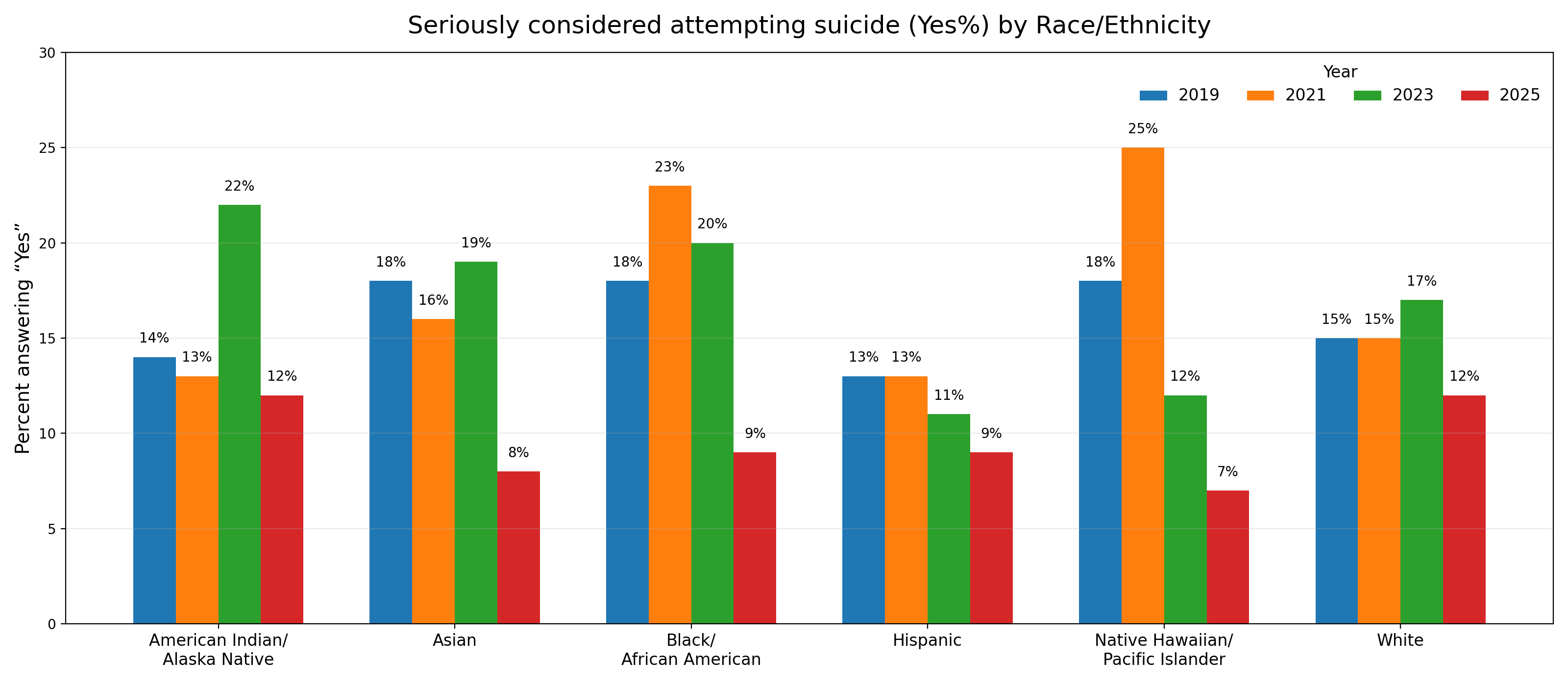 This chart details responses from the California Healthy Kids Survey concerning students' considerations of suicide over several years, segmented by ethnicity. The data underscores a troubling but important issue: a consistent minority of students across all groups reported having seriously considered attempting suicide. Across race/ethnicity, the percentage of students who seriously considered attempting suicide is generally higher in 2019–2023 and drops in 2025 for every group. Several groups peak earlier: Native Hawaiian/Pacific Islander reaches the highest level in 2021 (25%) before falling to 7% in 2025; Black/African American peaks in 2021 (23%) and declines to 9% in 2025; American Indian/Alaska Native peaks in 2023 (22%) and drops to 12% in 2025. Asian students decline from 18–19% (2019–2023) to 8% (2025), while White decreases from 15–17% down to 12%. Hispanic is comparatively lower and steadier overall (13% → 13% → 11% → 9%).